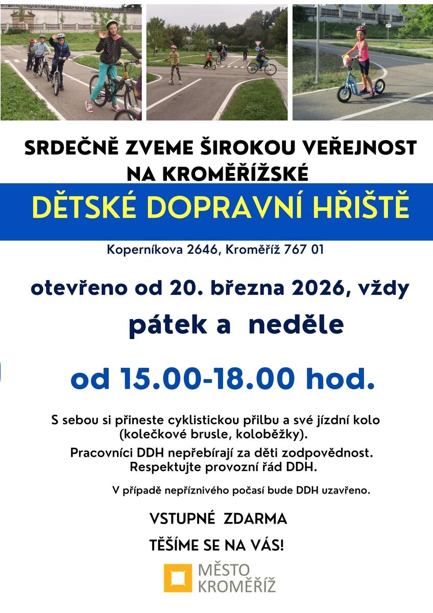 Kroměřížské dětské dopravní hřiště sídlící v Koperníkově ulici zahajuje po zimě provoz. Veřejnosti bude otevřené od 20. března, a to vždy v pátky a neděle. Zároveň se tu začínají konat akce pro základní, mateřské školy a družiny a také tradiční soutěže. „Děti si na hřišti mohou vyzkoušet pohyb v podmínkách podobných silničnímu provozu, a to jak na silnicích na kolech a koloběžkách, tedy v pozici řidiče, tak i na chodnících a přechodech, tedy z pohledu chodce. A právě toto srovnání a zkušenosti jsou důležité pro jejich následný bezpečný pohyb v reálných podmínkách běžného provozu,“ uvedl místostarosta Karel Holík.
