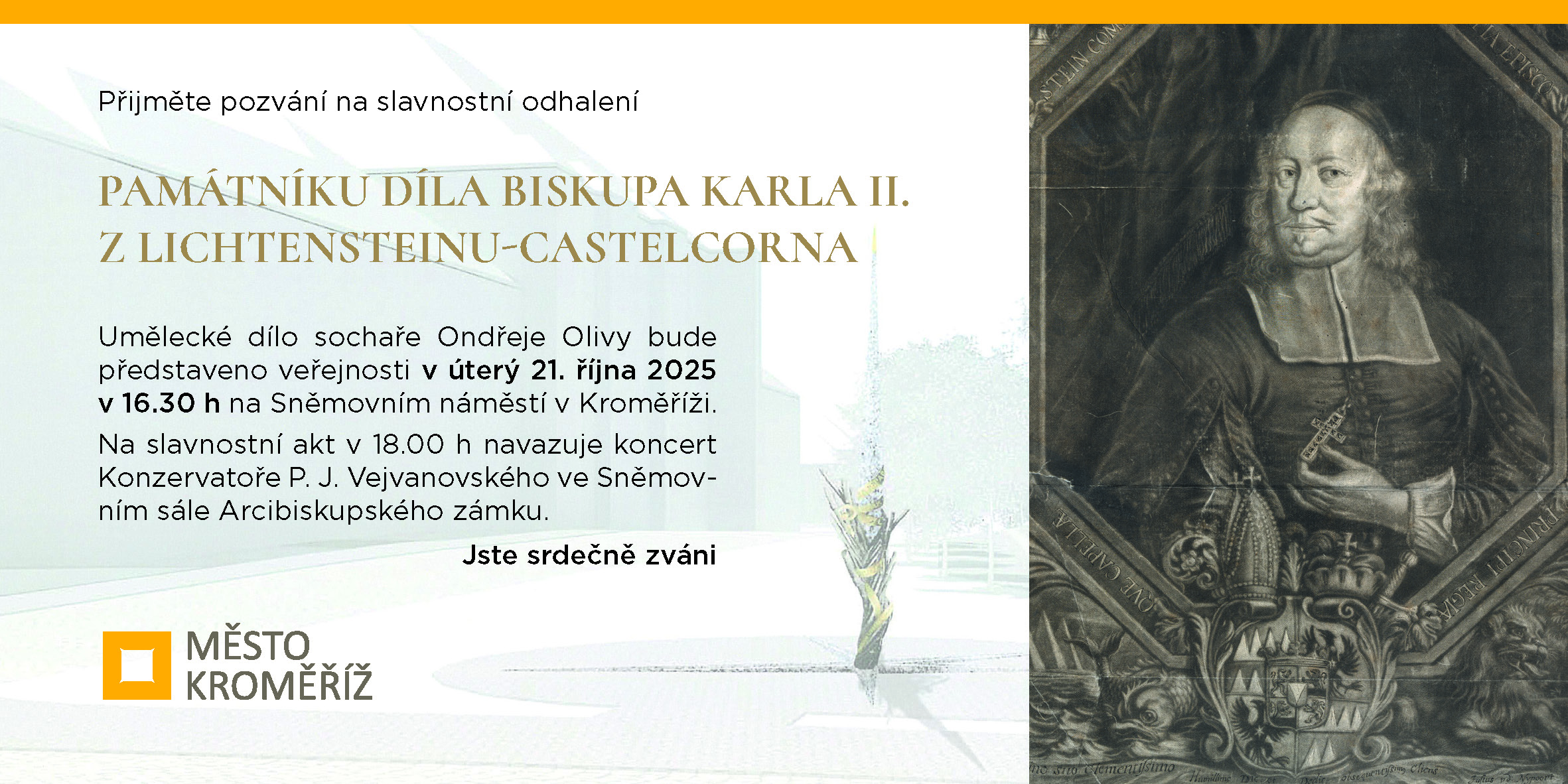 Město Kroměříž chystá slavnostní odhalení památníku díla biskupa Karla z Lichtensteinu – Castelcorna. „Umělecké dílo sochaře Ondřeje Olivy bude představeno veřejnosti v úterý 21. října 2025 v 16:30 hodin na Sněmovním náměstí. Na představení díla naváže v 18 hodin koncert symfonického orchestru, žesťového oktetu a pěveckého sboru Konzervatoře P. J. Vejvanovského konaný ve Sněmovním sále Arcibiskupského zámku,“ uvedl radní pro kulturu, cestovní ruch a památkovou péči Jiří Kašík.