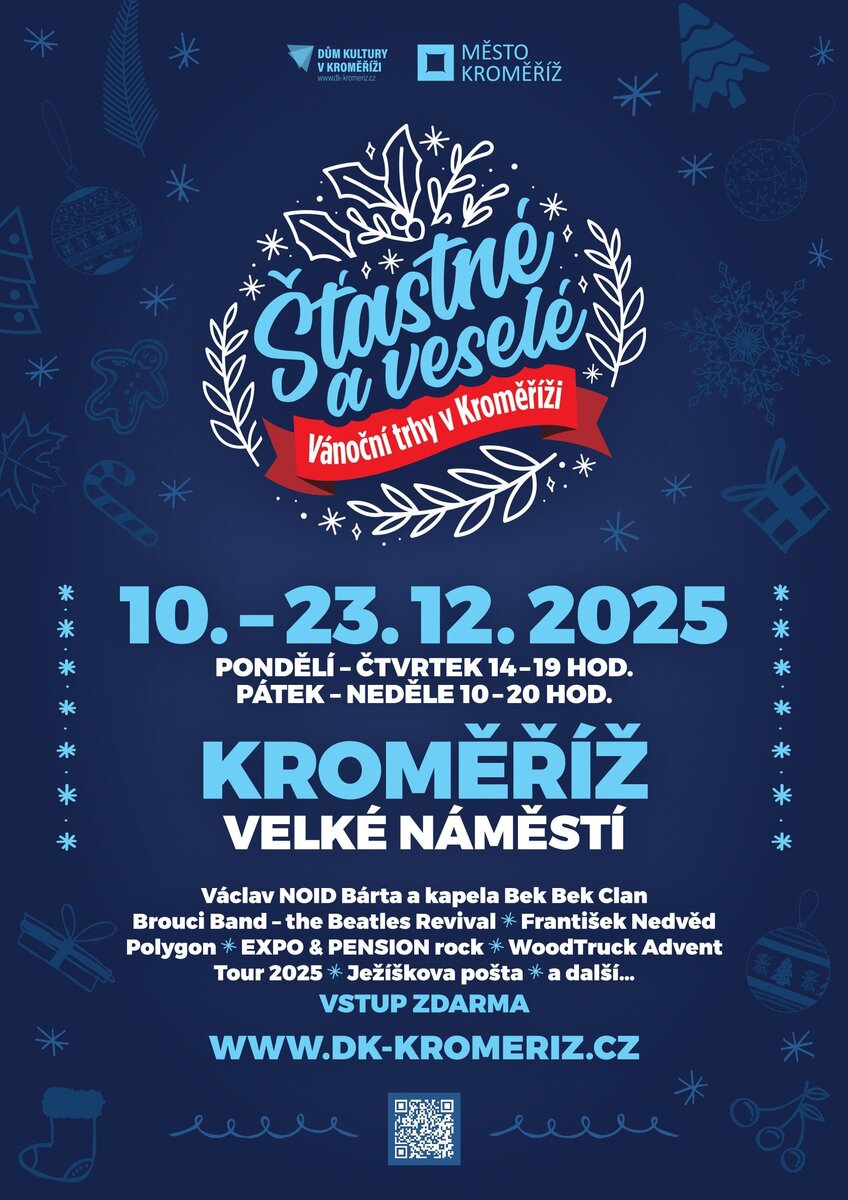 Dva předvánoční týdny pak bude Velké náměstí patřit vánočním trhům s názvem Šťastné a veselé. Ty budou návštěvníky od 10. do 23. prosince lákat na tradičně velkolepou světelnou výzdobu, na prodejní stánky s vánočním sortimentem, v němž nebudou chybět dárky, ozdoby, svíčky i sváteční nápoje, pochutiny, perníčky a cukroví, a na kulturní program. V něm vystoupí mimo jiné v sobotu 13. prosince Václav Noid Bárta s kapelou Bek Bek Clan, na zlatou neděli 21. prosince skupina Brouci Band – The Beatles Revival. Zahrají a zazpívají také František Nedvěd i regionální kapely jako například Polygon či Expo & Pension rock. Lákadlem pátečních, sobotních a nedělních odpolední bude kovářská dílna, stejně jako v loňském roce. Nově ale budou ve stejnou dobu probíhat také cukrářské dílničky pro děti doplněné o prodej selských máslových koláčů oceněných titulem Haná regionální produkt. Novou podobu bude mít tradiční Ježíškova pošta. Děti (a třeba i dospělí) budou moci napsat svá přání a vhodit je do schránky ve speciálním „vánočně poštovním“ domečku. Odtud přání poputují v sobotu 20. prosince za doprovodu členů biskupské gardy tam, kde se postarají o jejich splnění. Poslední den trhů 23. prosince zavítá do Kroměříže WoodTruck se svou pojízdnou vánoční vesničkou v rámci Advent Tour 2025. Návštěvníci se mohou těšit na soutěže, dílničky, vánoční fotokoutek i na speedcarving show, při níž vznikne přímo před zraky diváků pomocí motorové pily během pár minut vánoční socha. Prodejní doba stánků s vánočním zbožím bude od pondělí do čtvrtka od 14 do 19 hodin, od pátku do neděle pak od 10 do 20 hodin.