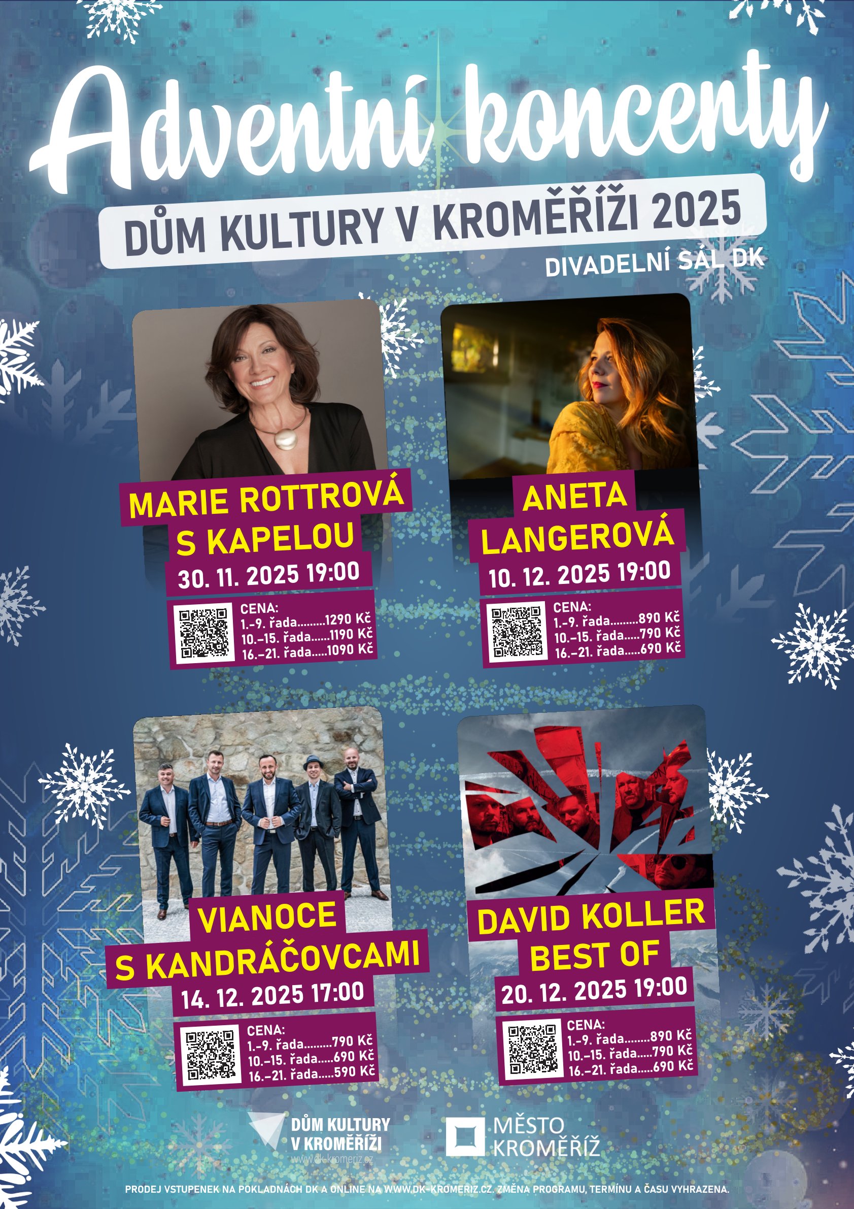 K předvánočnímu času patří v Kroměříži nejen stylové trhy, jarmarky, světýlka a vánoční strom na Velkém náměstí, ale také cyklus adventních koncertů. „Čtveřice hudebních vystoupení v divadelním sále Domu kultury patří k oblíbeným a vyhledávaným kulturním zážitkům, které dokážou navodit sváteční předvánoční atmosféru a umožnit pozastavení a zklidnění v hektickém čase mnohdy plném shonu a vánočních příprav,“ uvedl Jiří Kašík, radní pro kulturu a cestovní ruch. První příležitostí k adventnímu zastavení bude v neděli 30. listopadu koncert Marie Rottrové. „První dáma českého soulu“ přiveze do Kroměříže své největší hity i vánoční písně. Na pódiu s ní vystoupí kapela Septet Plus Orchestra a zpěvák Petr Němec. Druhým bodem programu adventních koncertů bude 10. prosince vystoupení Anety Langerové. Zpěvačka, hudebnice a skladatelka přijíždí do Kroměříže poněkolikáté a jistě udělá svým příznivcům radost. Třetí adventní hudební představení proběhne v režii slovenského hudebního souboru Kandráčovci. V neděli 14. prosince strhne jejich energie a cit pro lidovou hudbu také kroměřížské diváky. Čtvrtý adventní koncert v sobotu 20. prosince udělá radost milovníkům hudby i osobnosti Davida Kollera. Na playlistu vánočního koncertu nebudou chybět zásadní hity jeho sólové kariéry ani legendární skladby z éry Lucie v nových aranžích.