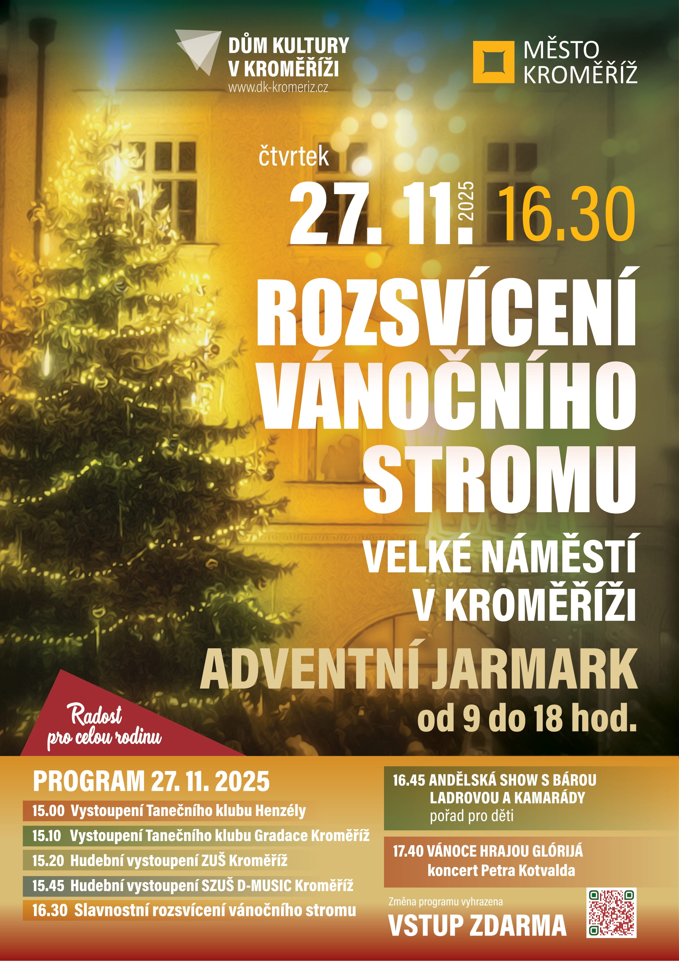Adventní jarmark bude probíhat od 9 do 18 hodin a prodejní stánky budou nabízet vánoční zboží, drobné dárky, ozdoby, věnce, chvojí a jmelí i sváteční dobroty, punče, svařáky, medoviny, cukroví, perníčky a další stylový sortiment. Program na pódiu na Velkém náměstí začne v 15 hodin. Připravená jsou vystoupení taneční, o která se postarají členové kroměřížských tanečních klubů Henzély a Gradace, následovat budou hudební vystoupení, která připravily ZUŠ Kroměříž a soukromá umělecká škola D-MUSIC Kroměříž. Vrchol, tedy slavnostní rozsvícení vánočního stromu před budovou radnice a světelné výzdoby, přijde na řadu v 16.30 hodin. Podium poté bude patřit dětem, připravená je Andělská show s Bárou Ladrovou a kamarády. Závěrečným bodem programu bude v 18 hodin koncert Petra Kotvalda, jehož vánoční píseň Vánoce hrajou glórijá dala název celému hudebnímu pořadu.