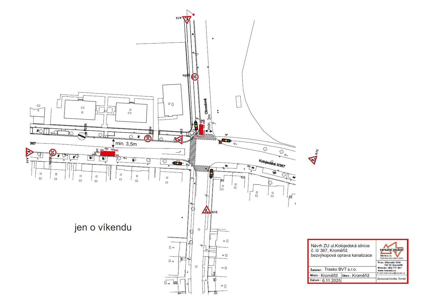 Motoristé musejí počítat s částečnou uzavírkou ulic Kotojedská a Obvodová, kde se bude pracovat pouze o víkendu, kdy je v lokalitě menší provoz. Oprava omezí i světelnou křižovatku ulic. „V ulici Obvodová bude zábor částečně zasahovat do přechodu pro chodce, který však pro chodce zůstane otevřený. V tomto úseku bude snížena maximální rychlost na 30 kilometrů za hodinu,“ uvedl Pavel Zavadil z odboru služeb kroměřížské radnice.