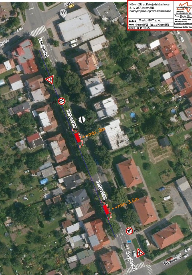Společnost Vodovody a kanalizace Kroměříž (VaK) bude pokračovat v opravách kanalizace v ulici Kotojedská. Předpokládaný termín prací je od 24. listopadu do 19. prosince. Kanalizaci bude bezvýkopovou metodou opravovat společnost TRASKO BVT z Vyškova. Akce si vyžádá omezení dopravy.