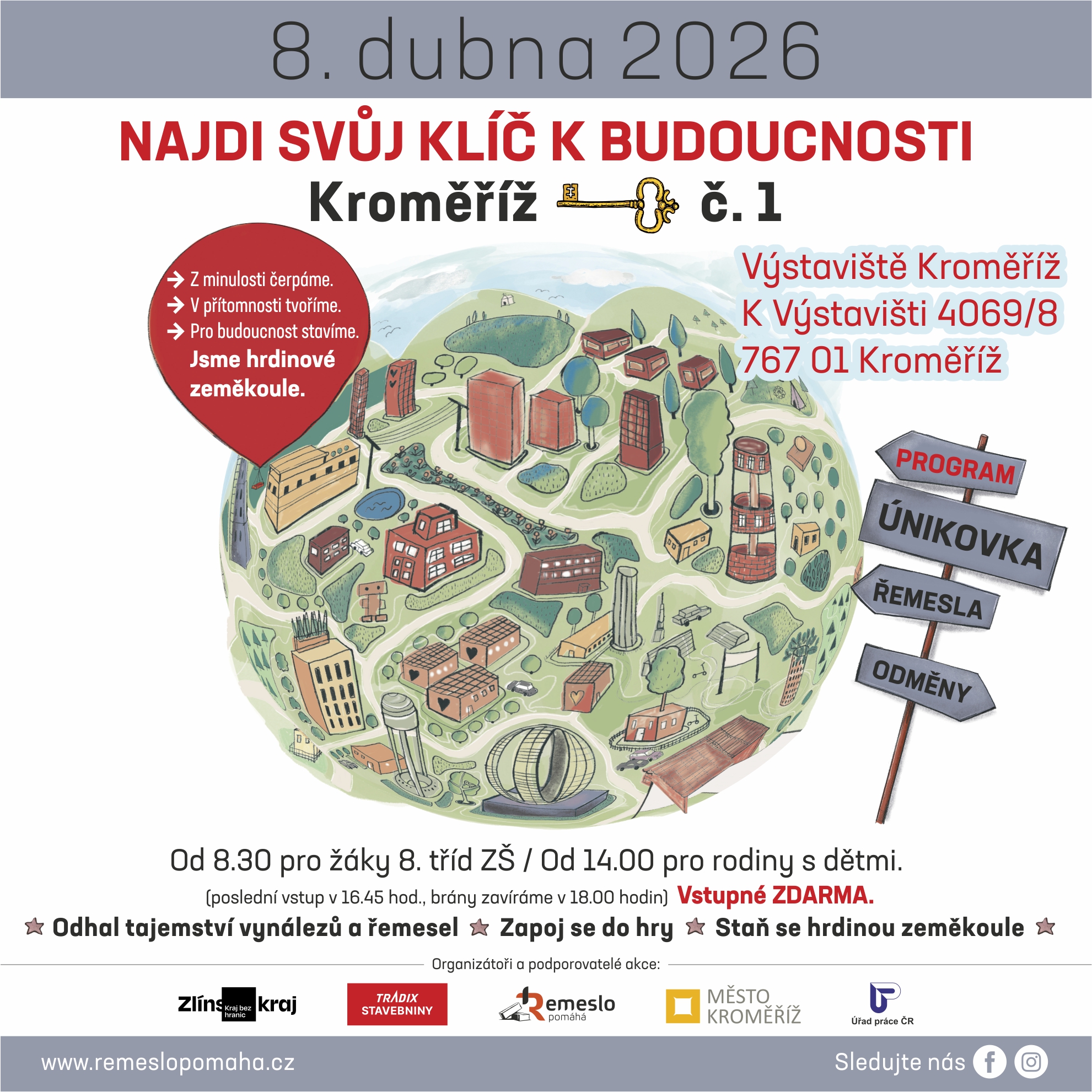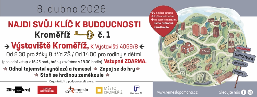 Výstaviště Kroměříž se stane na začátku dubna místem konání akce, která originálním, hravým a interaktivním způsobem seznámí žáky vyšších tříd základních škol s možnostmi studia a budoucími pracovními příležitostmi. Projekt s názvem Najdi svůj klíč k budoucnosti bude největší akcí svého druhu konanou v rámci Zlínského kraje a uskuteční se ve středu 8. dubna od 8.30 do 18 hodin. Dopolední program je určený žákům základních škol, od 14. hodiny pak budou všechna stanoviště v prostorách výstaviště k dispozici rodinám s dětmi.